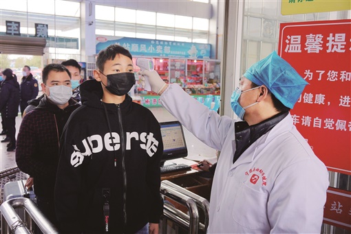2月9日,宁远县汽车总站,医务人员为入站旅客测量体温。当天,为应对春节后首波返程高峰,县公安、卫健、运政等各部门压实责任,加大联防联控力度,为旅客有序入站、平安出行提供服务。 乐水旺 摄
