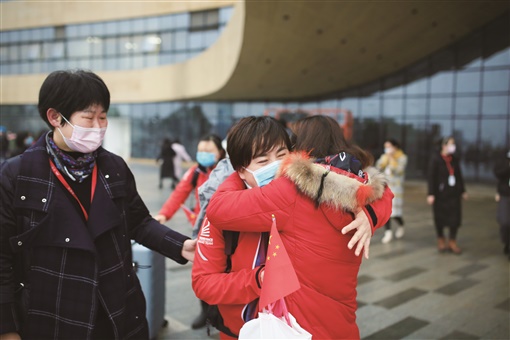 上图:2月11日,湖南妇女儿童医院,对口支援黄冈医疗队队员与亲友和同事告别。