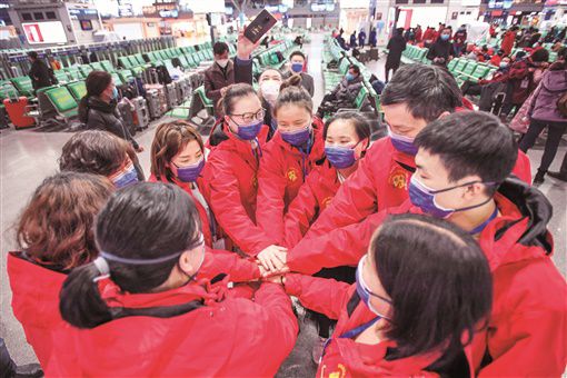 上图:2月11日,长沙高铁南站,医疗队队员出发前互相加油鼓劲。