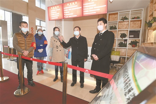 2月16日,长沙市雨花区东塘街道湖南商会大厦,防疫联络员在检查楼宇企业防疫措施落实情况。该大厦所在的浦沅社区有4栋大型商业楼宇,共有240家楼宇企业、110余家社区五小门店。最近,雨花区先后派出7名干部到社区担任防疫联络员,帮助企业及门店抓好疫情防控、复工复产。湖南日报记者 田超 通讯员 周红 摄影报道