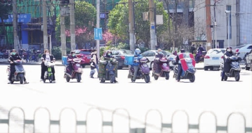 2月17日上午,蔡锷路上骑行电动车和电动自行车的市民。 顾荣 摄