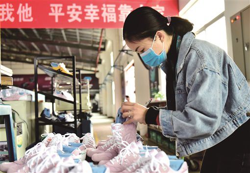 2月22日,蓝山县经济开发区永州湘威运动用品有限公司,员工在生产运动鞋。该公司自2月10日复工以来,坚持疫情防控和发展生产两手抓,每天生产运动鞋16000余双,产品出口韩国、墨西哥、意大利等国家。目前,该县57家规模以上企业已复工复产赶制订单,实现了防疫和生产两不误。杨雄春 摄