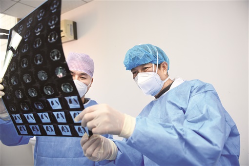 2月23日,湖北省黄冈市英山县人民医院,65岁的李新中(右)仔细查看患者的CT检查结果。他是湖南援助黄冈医疗队中年龄最大的队员。记者 辜鹏博 朱玉文 摄影报道
