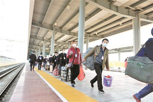 2月24日,湖南定制返岗专列从娄底南站出发,456名务工人员搭乘G9628次定制专列前往珠三角地区返岗复工。这趟复工专列由双峰县人民政府定制,从娄底南站开往广州南站。李建新 摄