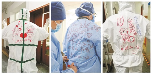 2月25日,湖北省麻城市人民医院,湖南对口支援黄冈医疗队队员陈媛佳在同事的隔离服上画上“萌萌哒”漫画。陈媛佳来自益阳市中心医院,并没有专业学过绘画,她把小龙虾、热干面、新冠病毒等元素都放到了漫画里,“希望这些漫画能缓解同事的压力,也能给患者以坚持的力量。”湖南日报记者 辜鹏博 朱玉文 摄影报道
