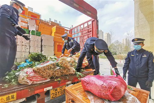 3月1日,湖北省黄冈市,志愿者将湖南送来的蔬菜卸货。当天,湘菜产业促进会联系捐赠的30吨物资送到湖南支援黄冈医疗队驻地。除了时令蔬菜,还有成箱的白辣椒炒肉、扣肉和外婆菜等,都是地道的“湖南风味”。记者 辜鹏博 邹晨莹 摄影报道