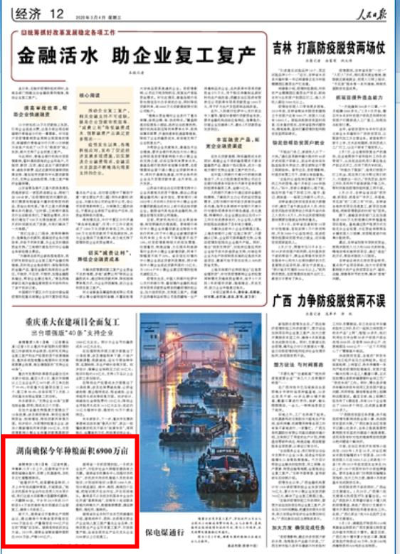 前不久,湖南省召开春耕生产视频会议,提出确保今年粮食面积稳定在6900万亩左右、产量稳定在590亿斤左右的“两稳”总目标。湖南是传统的农业大省。2019年,湖南全省粮食播种面积达6924万亩,产粮595亿斤。
