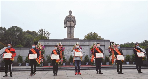 3月5日,湖南雷锋纪念馆塑像广场,长沙市望城区10位“学雷锋疫情防控最美志愿者”受到表彰。当天,该区举行2020年“3·5学雷锋纪念日”活动。活动现场,学雷锋先进集体、先进个人和疫情防控最美志愿者受到表彰,并发布了《关于加强学雷锋志愿服务,建设“志愿者之城”的实施方案》。该方案旨在健全长效机制,致力建设全国最具影响力的“志愿者之城”。湖南日报记者 徐行 摄
