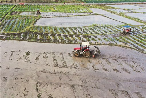 3月8日,蓝山县塔峰镇雷家岭村舜水田园综合体,农机手驾驶拖拉机耕田。阳春三月,春光明媚,农民抢抓农时耕田播种,田野上一片春耕农忙景象。杨雄春 摄