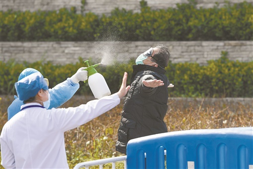 3月10日,武昌方舱医院,一名准备出院患者离开时工作人员为他全身喷洒酒精消毒。当天,该医院最后一批49名患者康复出舱。2月5日以来,该医院共收治病人1124人,其中出院833人,转院291人。