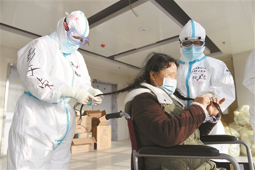 20分钟后,护士们将杨友枝推回病房。她意犹未尽,冒出一句:“出院的时候,你们再给我梳一次头吧。”