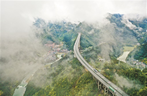 3月29日,娄怀高速公路溆浦县三江特大桥处,云雾汇聚,山水交融,各种车辆南来北往穿梭于雪峰山脉,推动大湘西地区经济社会加快发展。记者 李健 摄