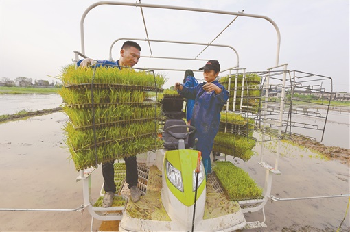 4月10日,长沙县春华镇石塘铺村,横坑农机专业合作社的农民在装载秧苗。该社今年外包各种农业设备近20台套,服务水稻种植5000余亩。目前,我省已投入各类农机具122万台套,助力今年的春耕生产。湖南日报记者 徐行 通讯员 林妤 摄影报道