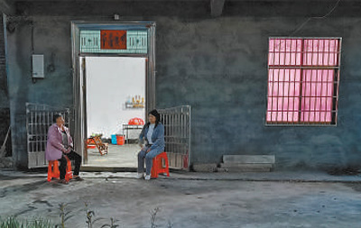 4月13日傍晚,肖翠兰(右)来到黄新桂家,和他的母亲拉家常。段庆龙摄