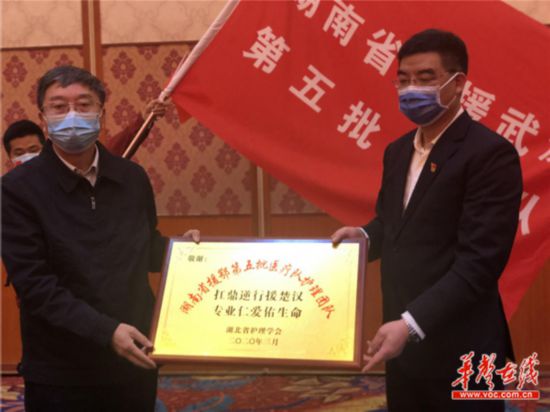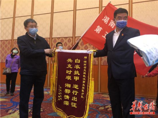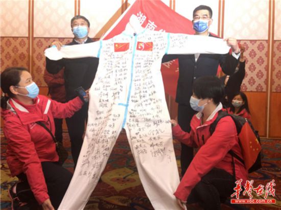 自4月7日返湘后,队员们回到相应市州进行隔离。今日上午,在长沙隔离点,湖南省卫健委为80多名队员举行了解除隔离欢送仪式。现场展示了武汉市新冠肺炎疫情防控指挥部、武汉市东西湖区疫情防控指挥部、金银潭医院送来的三面致谢锦旗,湖南省第五批援助湖北医疗队全体人员签名的防护服,湖北省护理学会赠送的牌匾,上书:扛鼎逆行援楚汉,专业仁爱佑生命。中共湖南省第五批援助湖北应对新冠肺炎疫情医疗队临时委员会给每位队员写了感谢信,长沙市开福区卫生健康局给每位队员发了解除医学观察告知书。