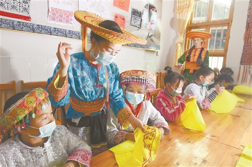 4月30日,隆回县虎形山瑶族乡民族团结学校,学生在兴趣班上跟着老师学习花瑶挑花。2013年下半年起,该校将花瑶非物质文化遗产项目——挑花和呜哇山歌引进校园,邀请非遗传承人和花瑶老师教学,已有1000余名学生参加了学习。(记者 田超 通讯员 伍锡辉 摄影报道)