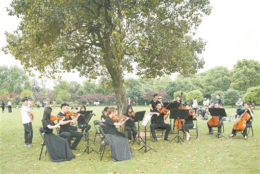 5月1日,长沙交响乐团在橘子洲头进行弦乐合奏。记者 傅聪 龙文泱 摄影报道