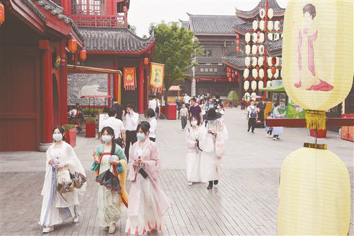5月1日,游客在长沙方特东方神画乐园休闲游玩。“五一”假期,该园举办“华裳盛典”汉服主题秀等系列活动,为游客带来丰富多彩的古风“穿越”之旅。记者 徐行 通讯员 周鹏伟 摄影报道