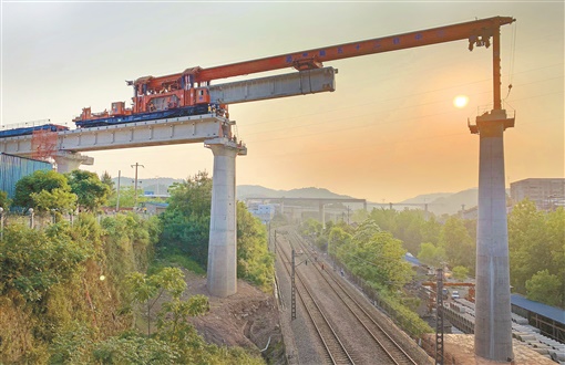 5月7日,渝怀铁路增建二线碑现2号特大桥施工现场,中铁二十五局一公司施工人员在利用封锁的“天窗”时间加紧架设T梁。当天,该增建二线湖南段首次成功进行上跨铁路架梁施工,这标志着往重庆方向延伸的控制点架梁工程顺利打通。邓浩琳 黄诗伟 摄影报道