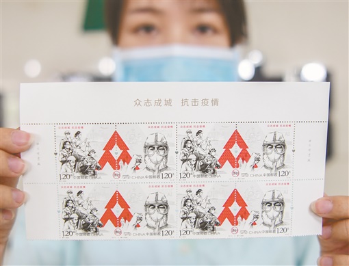 5月11日,长沙市邮政公司集邮专卖店,工作人员在展示《众志成城 抗击疫情》邮票。当天,中国邮政集团有限公司特别发行《众志成城 抗击疫情》邮票1套2枚,全套邮票面值2.40元,计划发行1450万枚。邮票、邮品发行收入,将捐赠用于抗击疫情工作。记者 傅聪 摄