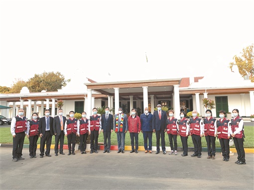 5月12日,津巴布韦总统姆南加古瓦(左九)率内阁成员在总统府接见中国(湖南)抗疫医疗专家组全体成员。通讯员 摄
