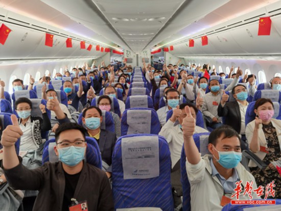 飞机上,在湘全国人大代表为中国(湖南)赴津巴布韦抗疫医疗专家组点赞。记者 罗新国 摄