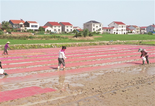 5月18日,澧县城头山镇牌楼村,村民在播撒优质水稻种子。今年,该县对隆两优1212等15个优质稻品种做好品比试验,为高产丰收奠定基础。柏依朴 摄