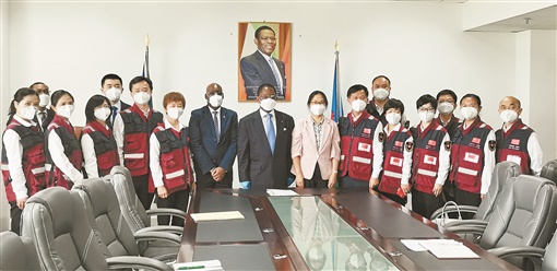 当地时间6月3日,赤道几内亚总理奥巴马(左九)在总理府会见中国政府援赤道几内亚抗疫医疗专家组。徐芙蓉 张玉 摄影报道