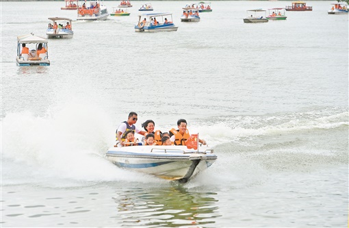 6月26日,湖南烈士公园,众多游客泛舟年嘉湖。端午假期,人们纷纷走出家门休闲度假,放松心情。记者 李健 摄