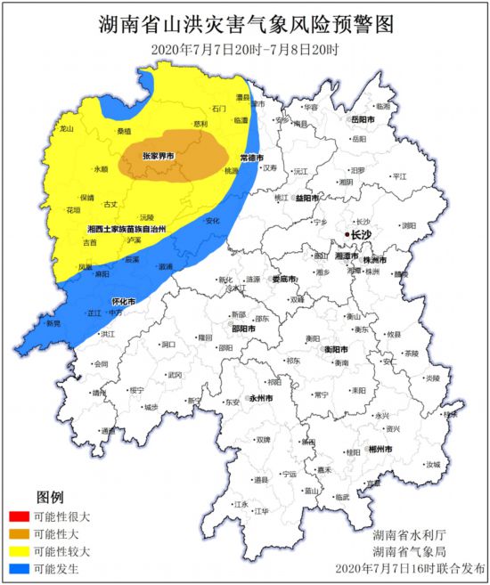 根据湖南省气象台7月7日短期气象预报情况,省水利厅与省气象局联合发布山洪灾害气象风险预警:自7月7日 20:00至8日 20:00,受降雨影响,常德市中部、张家界市北部、怀化市中部、益阳市西部、娄底市西北部、湘西自治州南部等局地可能发生山洪灾害(蓝色预警),常德市西北及西南部、湘西自治州大部、张家界市大部、益阳市西部局地、怀化市北部等局地发生山洪灾害的可能性较大(黄色预警),常德市西部局地、湘西自治州东部局地、张家界市南部、怀化市北部局地等发生山洪灾害的可能性大(橙色预警)。