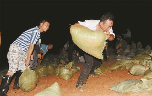 7月17日晚,澧县涔南镇上河口村,干群奋力搬运土袋除险。当天下午,涔南镇黄云河涵闸出现渗漏险情,镇指挥部迅速调动劳动力200余人,用土袋填充方式堵住涵闸渗水处,排除险情。 柏依朴 摄