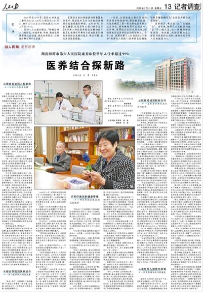 湘潭市六医院的探索实践,是湘潭市深入推进医养结合发展的一个缩影。推动镇街抓好乡村敬老院、街道社区卫生服务中心向医养结合型机构转型;鼓励医院以转型、改建等方式,发展康复医院、临终关怀医院……湘潭市副市长刘永珍说:“我们坚持深化改革、创新机制,深化医养结合,持续改善老年人健康养老服务,努力让所有老年人都能老有所养、老有所依、老有所乐、老有所安。”