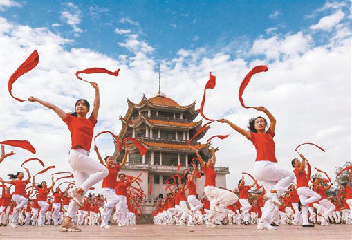 8月7日,健身爱好者在道县西洲公园进行集体表演。当天,该县1000名健身爱好者通过太极、广场舞、跆拳道等项目展示,共同迎接第12个“全民健身日”的到来。蒋克青 摄