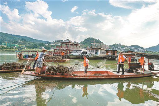7月30日,永顺县环保志愿者在芙蓉镇河面上打捞水上垃圾。近年来,该县启动“守好一江碧水,我是行动者”环保志愿者服务活动,加强对河流的管理保护,促进河流水质提升,推进生态文明建设。余光龙 摄