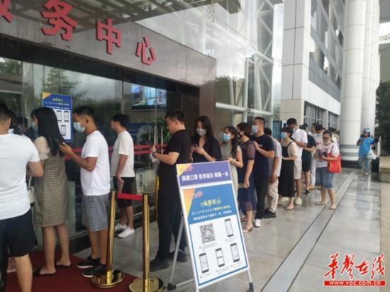 (8月25日,在长沙市岳麓区政务服务大厅外,办理结婚登记的队伍已经排到了外面。记者 杨昱 摄)
