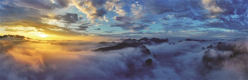 9月5日早晨,雨后的张家界武陵源景区,太阳初升,云雾缭绕,峰林、朝霞、云海、蓝天,构成一幅云涌奇峰美景。彭斌 摄
