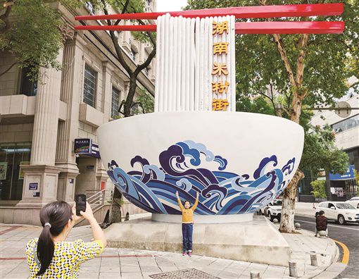 10月1日,长沙市韭菜园路“湖南米粉街”,市民在打卡拍照。当天,“湖南米粉街”开门迎客,湖南各市州最具特色的米粉云集于此,游客可以一街品遍。