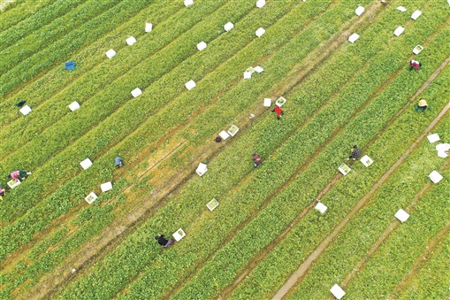 10月10日,道县梅花镇贵头村,村民在蔬菜基地采收菜薹。永州市作为全国首批设立的6个粤港澳大湾区“菜篮子”产品配送分中心之一,已有海关备案蔬菜基地57个,年出口蔬菜产值近3亿美元,生态蔬菜种植成为当地农民脱贫增收的支柱产业。何红福 摄