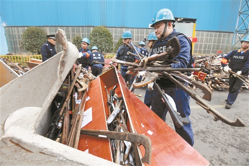 11月17日上午,公安部启动全国公安机关集中统一销毁非法枪爆物品活动,作为全国4个中心现场之一,省公安厅在位于湘潭市的华菱湘钢同步开展销毁活动,对去年9月以来全省公安机关收缴的8685支非法枪支、报废的730支公务用枪进行集中销毁。此外,还集中销毁了收缴的8500余把管制刀具。 近年来,湖南公安机关认真贯彻落实习近平总书记重要指示精神,严管严控枪支爆炸物品、依法从严惩处枪爆违法犯罪,全面推进深化打击整治枪爆违法犯罪专项行动,有力打击、有效遏制了枪爆违法犯罪活动。仅今年以来,全省各级公安机关破获涉枪涉爆案件1763起、抓获违法犯罪嫌疑人1541人。同时,接到群众举报线索171条,查证属实115条,兑现举报奖励20余万元。