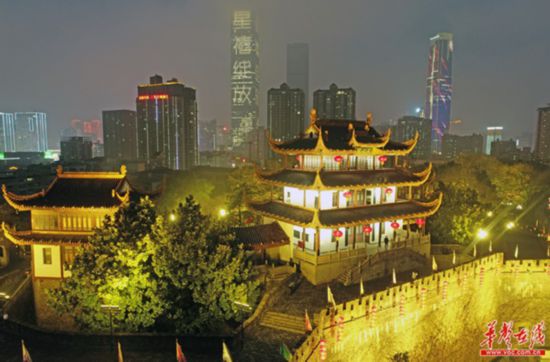 为迎接传统春节,该景区用2000个大红灯笼以及300余组小灯、千余面彩旗,把有2200多年历史的古城墙、历经400多年沧桑的天心阁装扮一新。