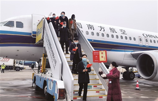 3月3日中午,出席全国政协十三届四次会议的住湘全国政协委员乘坐CZ8967次航班抵达北京。 许真 摄