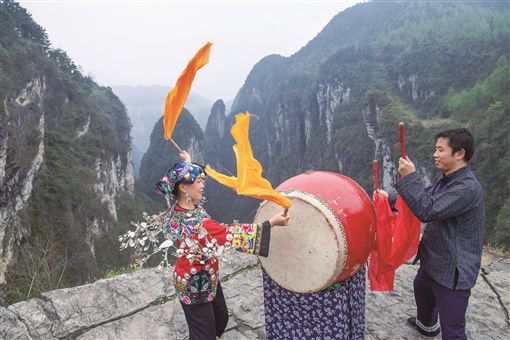3月15日,矮寨奇观景区,“苗鼓王”龙菊献(左)在天问台表演苗鼓。矮寨大桥通车后,景区游客多了,龙菊献回乡受聘,专职苗鼓表演。记者 辜鹏博 郭立亮 摄影报道