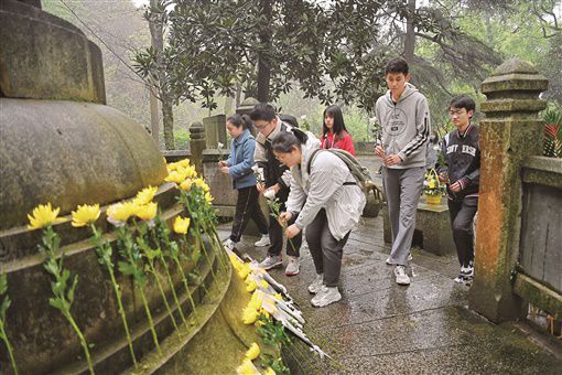 4月3日,长沙市岳麓山风景名胜区,市民在蔡锷墓前献花。当天,不少市民自发来到岳麓山,追忆历史,祭奠先烈。记者 傅聪 摄