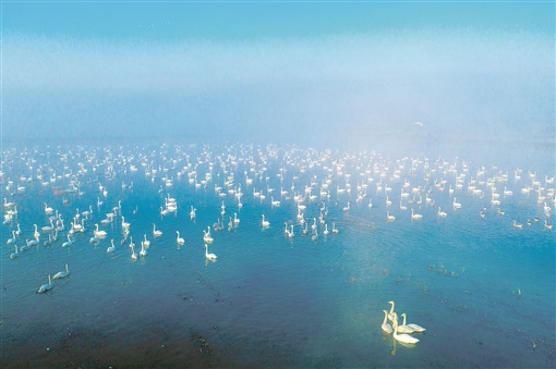 2020年11月13日,岳阳市屈原管理区东古湖湿地,成群结队的天鹅或在水中游弋,或在空中翱翔,蔚为壮观。近年,来东洞庭湖越冬的候鸟逐年增多。周洋 摄