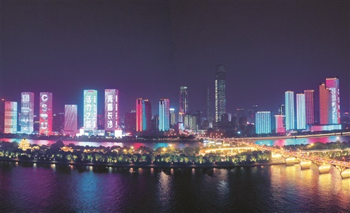 5月4日晚,长沙市临江楼宇外墙的LED光源不时出现“青春长沙”“活力之城”“团团爱你”等字样,庆祝五四青年节。“五一”期间,长沙一江两岸开启绵延二十多公里的震撼灯光秀,为市民和游客献上一场丰盛的视觉体验。邓霞林 摄