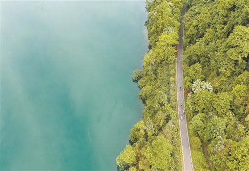 5月2日,游客在资兴市小东江东岸线骑行,畅享绿水青山之美。 朱孝荣 摄