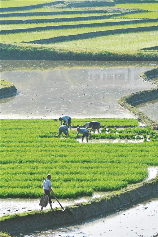 5月14日,双峰县井字镇石奇村,农民在复垦后的梯田上扯秧。今年,该县通过推进高标准农田改造和抛荒田的复耕复种,让昔日一些沉睡的山村田地重换绿装,恢复生机。李建新 摄
