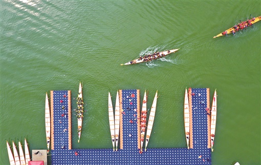 上图:6月12日,龙舟队伍在香草湖里劈波斩浪。当天,汨罗市屈子文化园开展为期3天的“魅力非遗,国潮端午”系列文旅活动。