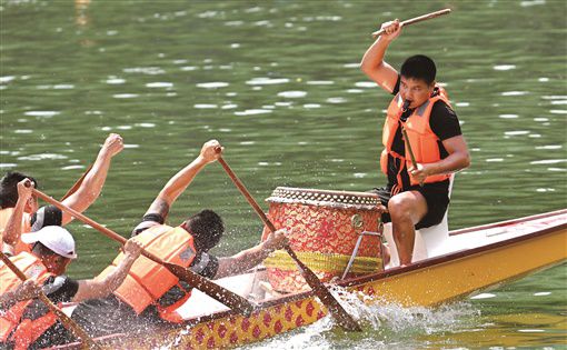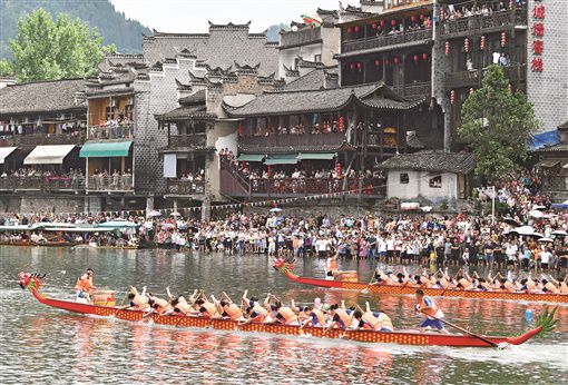6月13日,花垣县边城镇,龙舟队在奋勇竞技。端午假期,第十届湘渝黔三省(市)边区龙舟邀请赛举行,43支龙舟队在清水江上展开激烈角逐,吸引众多游客前来观看。龙恩泽 摄