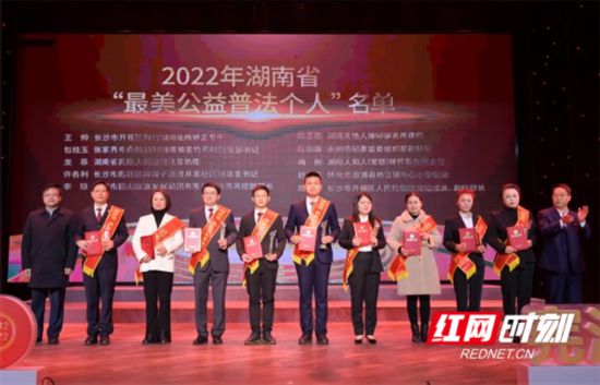 省委宣传部二级巡视员熊科文,省司法厅二级巡视员田自成为“2022年湖南省最美公益普法个人”颁奖。单位供图